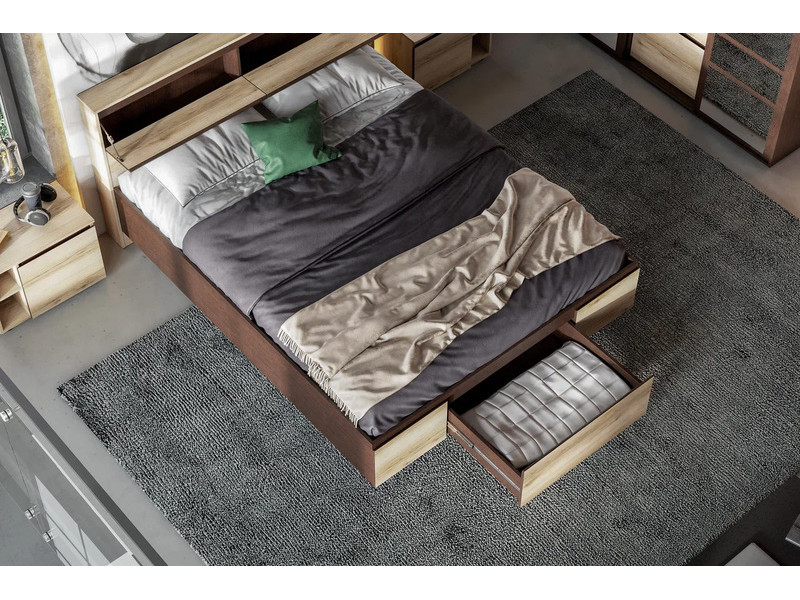 Массивное изголовье оборудовано двумя скрытыми ящикам с откидными створками для хранения необходимых в зоне сна предметов.