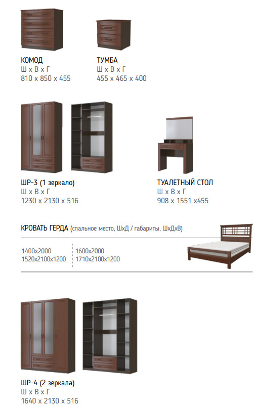 Цена за комплект: комод 4 ящика, тумба прикроватная, шкаф ШР-4, кровать ГЕРДА 1400 мм, Комплектующие на кровать с ламелями 1400 мм