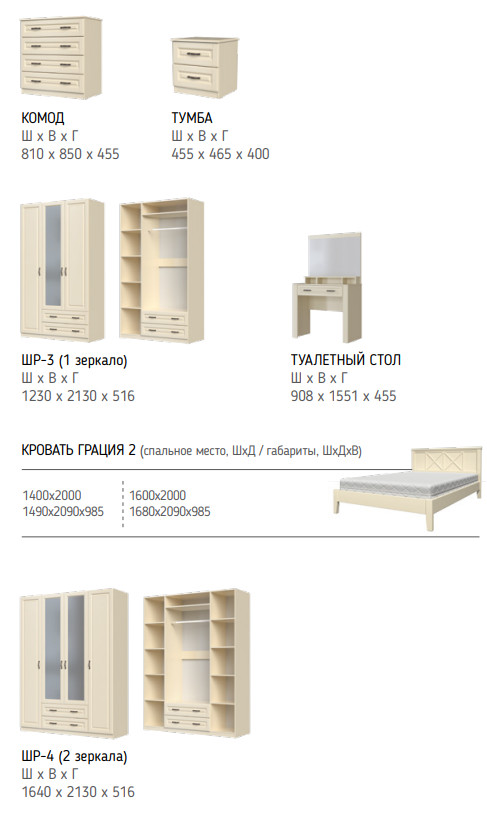 Цена за комплект: кровать ГРАЦИЯ-2 1400 мм, Комплектующие на кровать с ламелями 1400 мм, шкаф ШР-3, комод 4 ящика, тумба прикроватная
