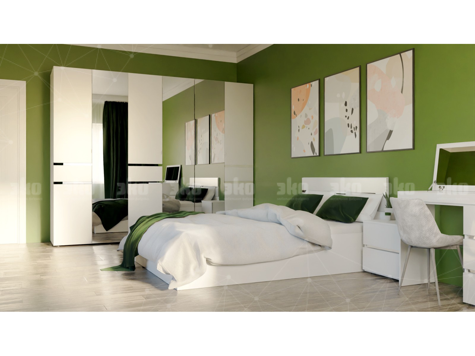 Состав комплекта: тумба прикроватная (2шт), кровать-1400, основание , опоры , шкаф 3-х створчатый, шкаф 4-х створчатый, стол туалетный