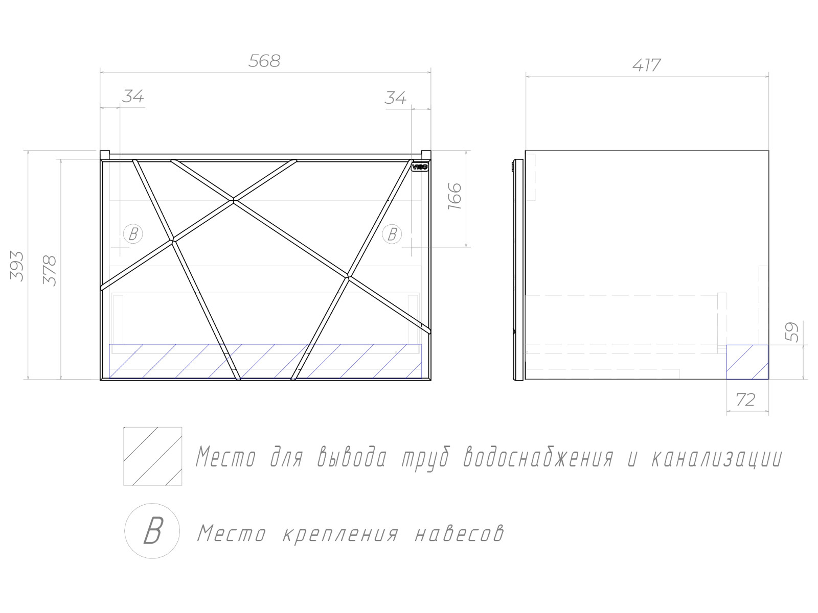 Оснащение: 1 выдвижной ящик, направляющие скрытого монтажа, открывание нажатием "push-to-open", 2 навеса, 1 сифон