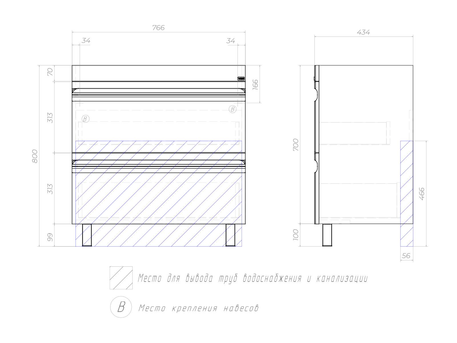 Оснащение:  2 выдвижных ящика, шариковые направляющие полного выдвижения, 2 опоры квадратные регулируемые, 1 сифон