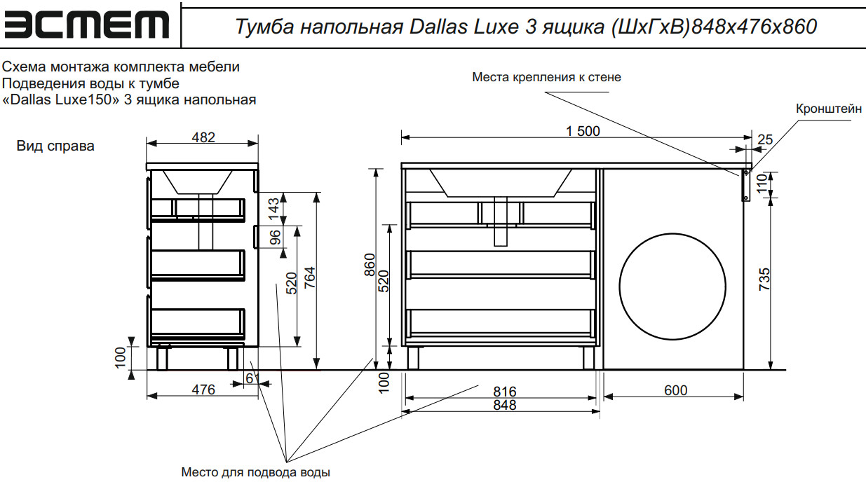 - Тумба с раковиной Dallas Luxe 1500 напольная 3 ящика левая