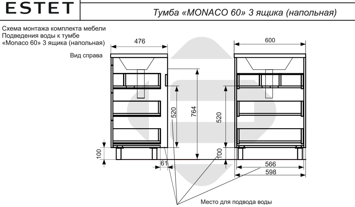 - Тумба с раковиной Monaсo 600 напольная 3 ящика