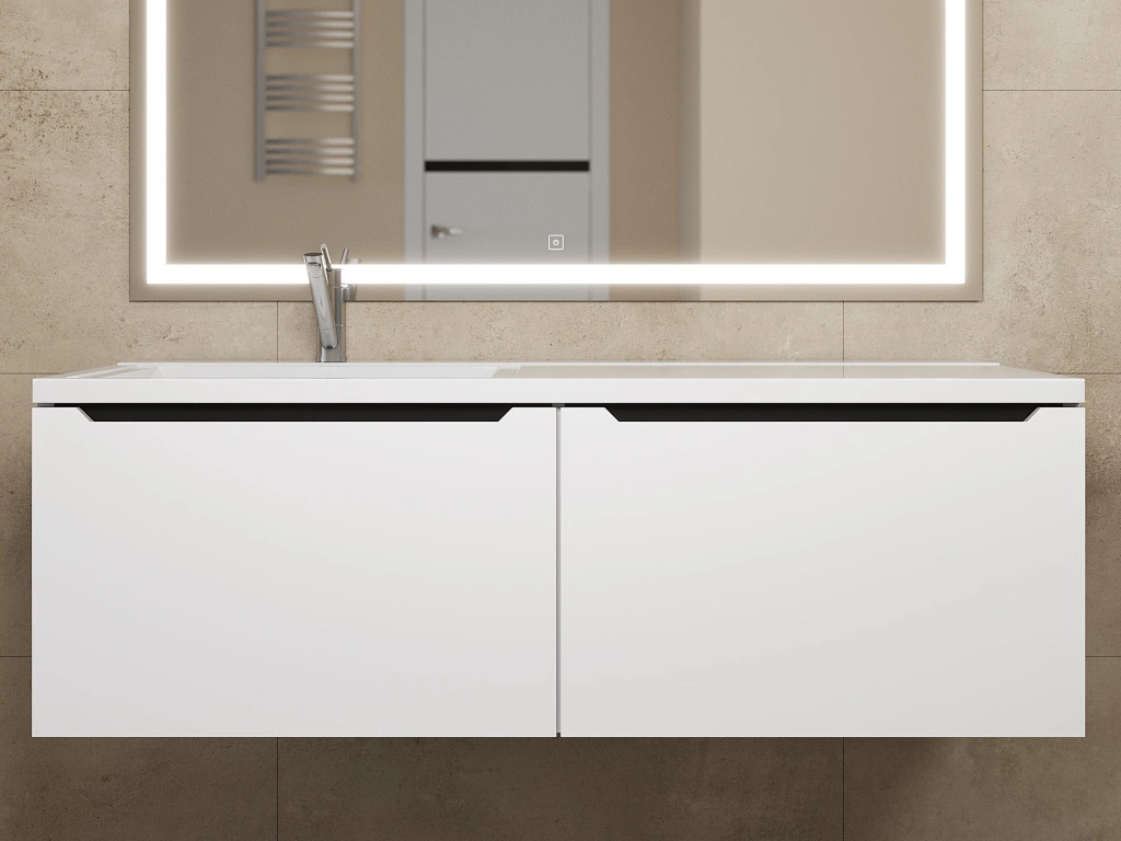 - Фасад и боковые стенки изделия выполнены из МДФ толщиной 16 мм. Покрытие тумб - Soft touch.