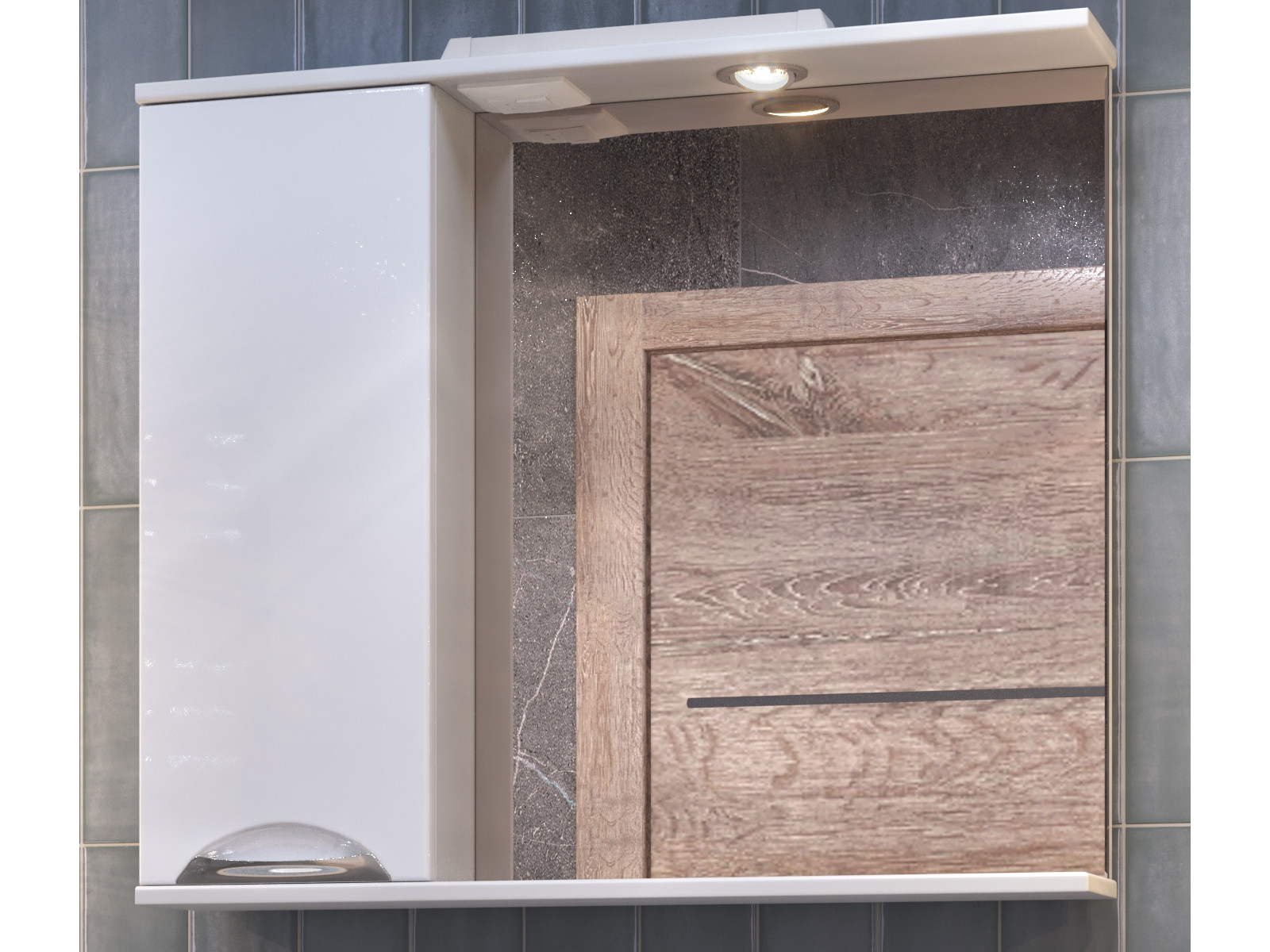 1 шкафчик справа, 1 дверца; 2 полки ЛДСП; ручки металлические хромированные; 1 светодиодный светильник, включатель с розеткой