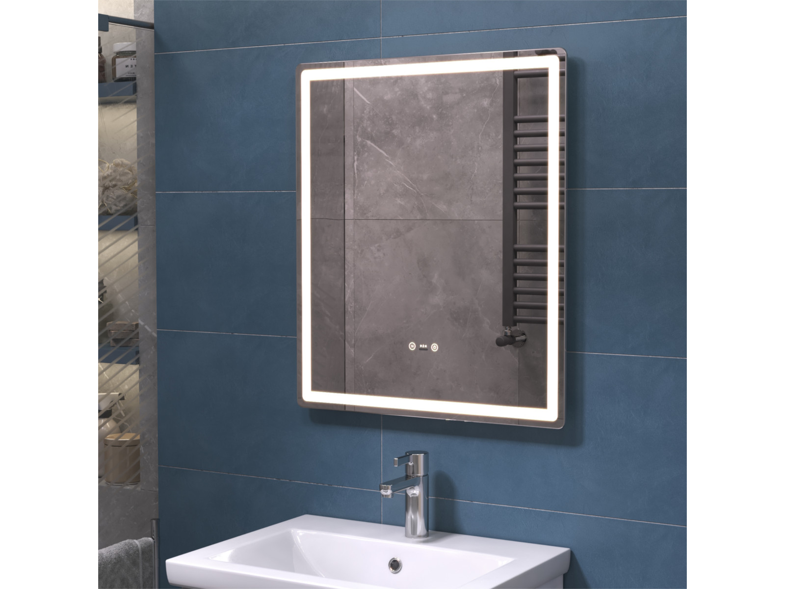 Подсветка фронтальная по периметру, с цветовой температурой 5000К – нейтральный белый, управление подсветкой сенсорное/датчик присутствия (1.5 м.)