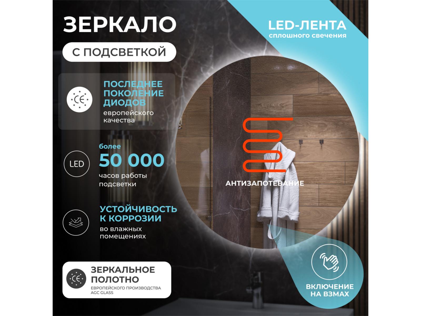 Подсветка Ambilight за полотном по периметру, с цветовой температурой 5000К – нейтральный белый, управление подсветкой бесконтактный выключатель «на взмах»