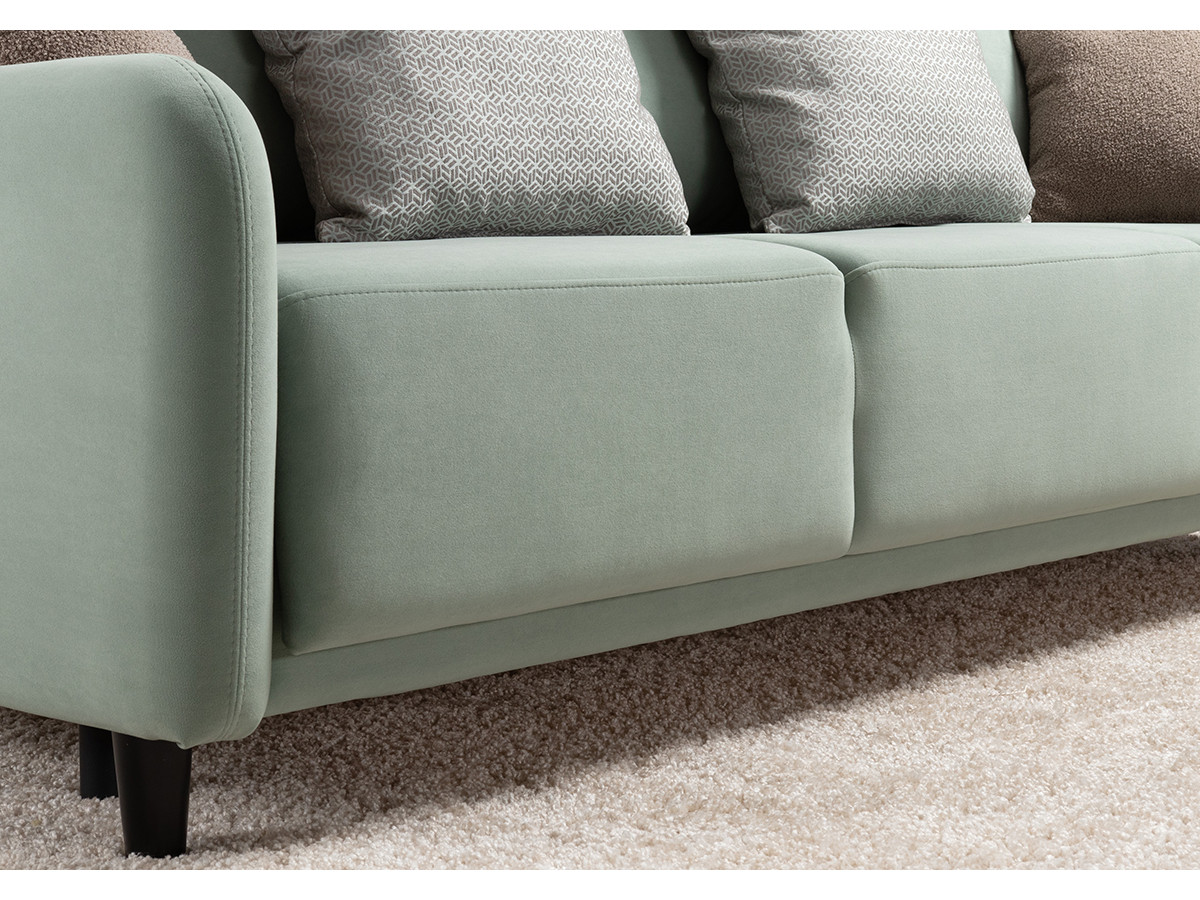 Декор: В комплекте 2 двусторонние декоративные подушки и 2 декоративные думки. Задняя спинка в ткани основы. Декоративные отделочные строчки по боковинам и сиденью