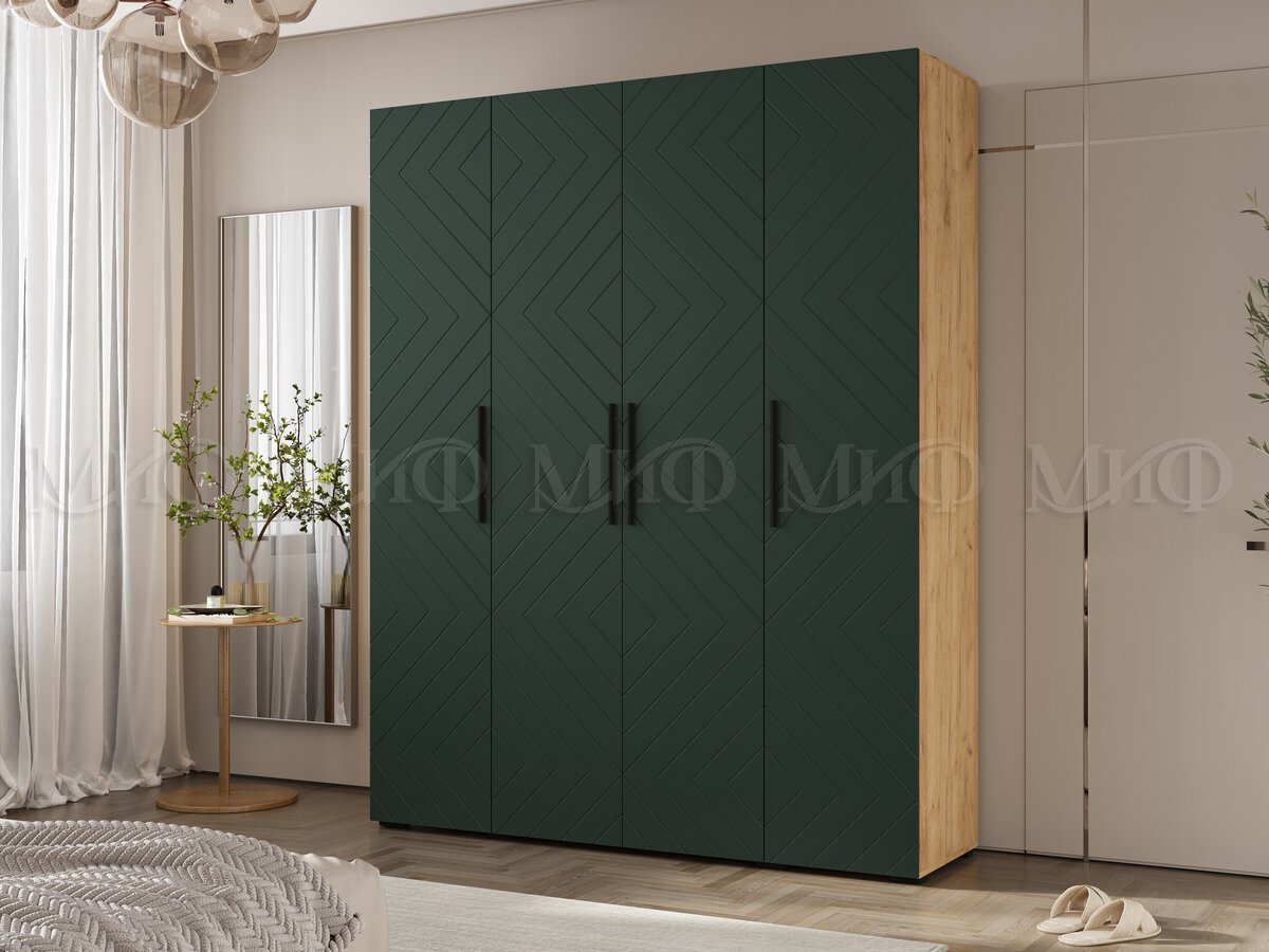 - Шкаф четырехстворчатый (1800) Флэш Браш Мени Грин, Дуб Крафт