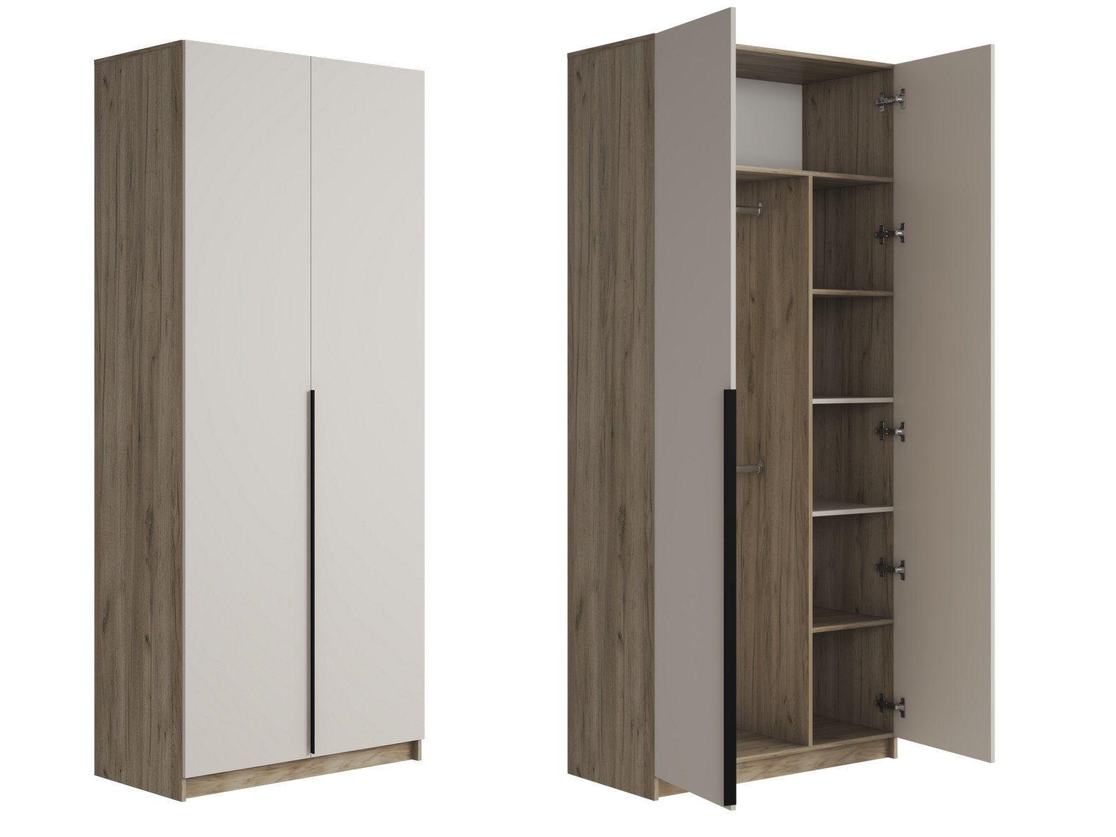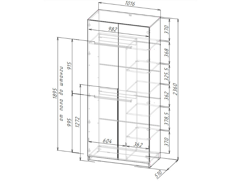 поделённое перегородкой на: секцию со штангами (ширина 604 мм) и секцию с полками (ширина 362 мм).