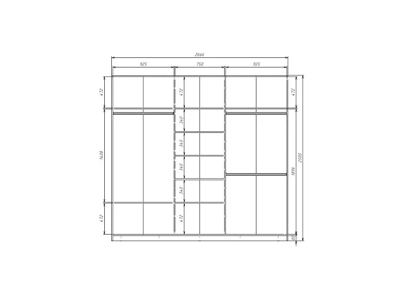 - 3 двери верхняя и нижняя вставка – ДСП 10 мм, две центральные – зеркало серебро.