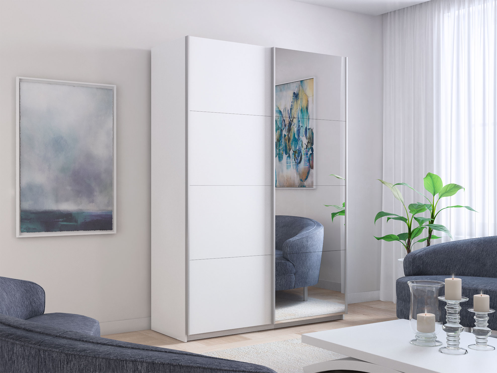 - Шкаф-купе Прайм 2-х дверный 1400 Зеркало/ДСП Белый Снег
