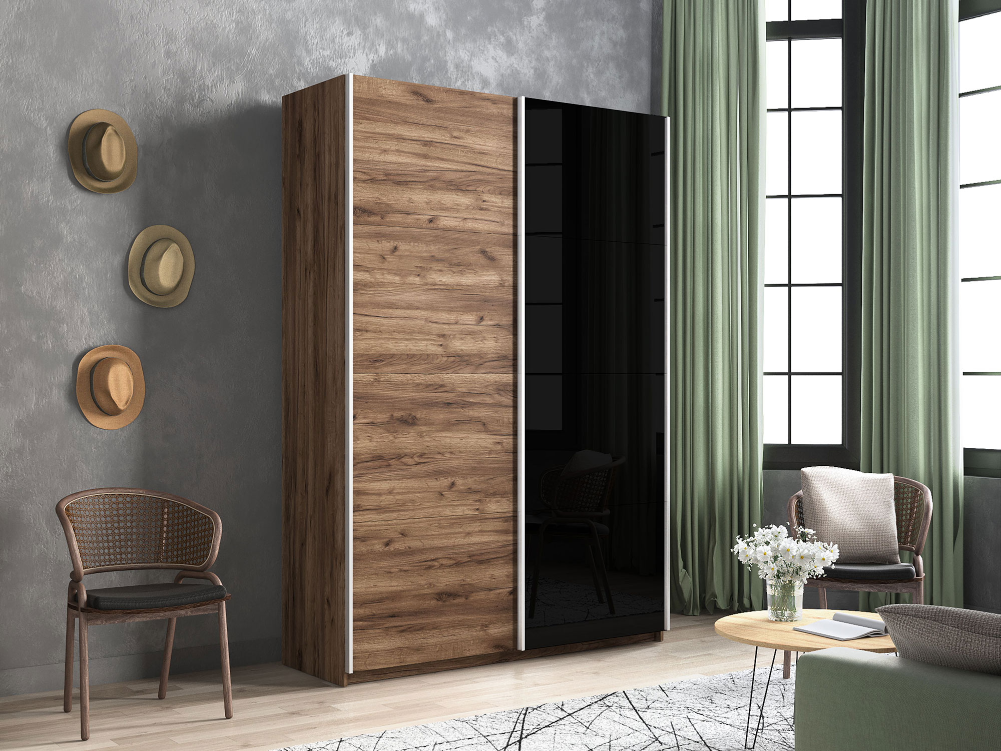 - Шкаф-купе Прайм 2-х дверный 1600 ДСП/Стекло Черное Крафт табачный