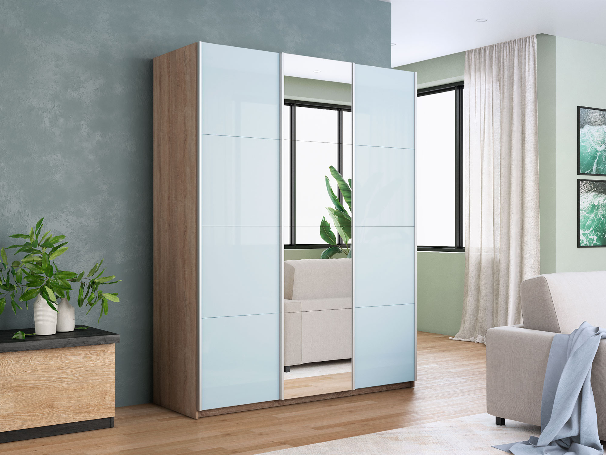- Шкаф-купе Прайм 3-х дверный 1800 два Стекла Белые/Зеркало Сонома