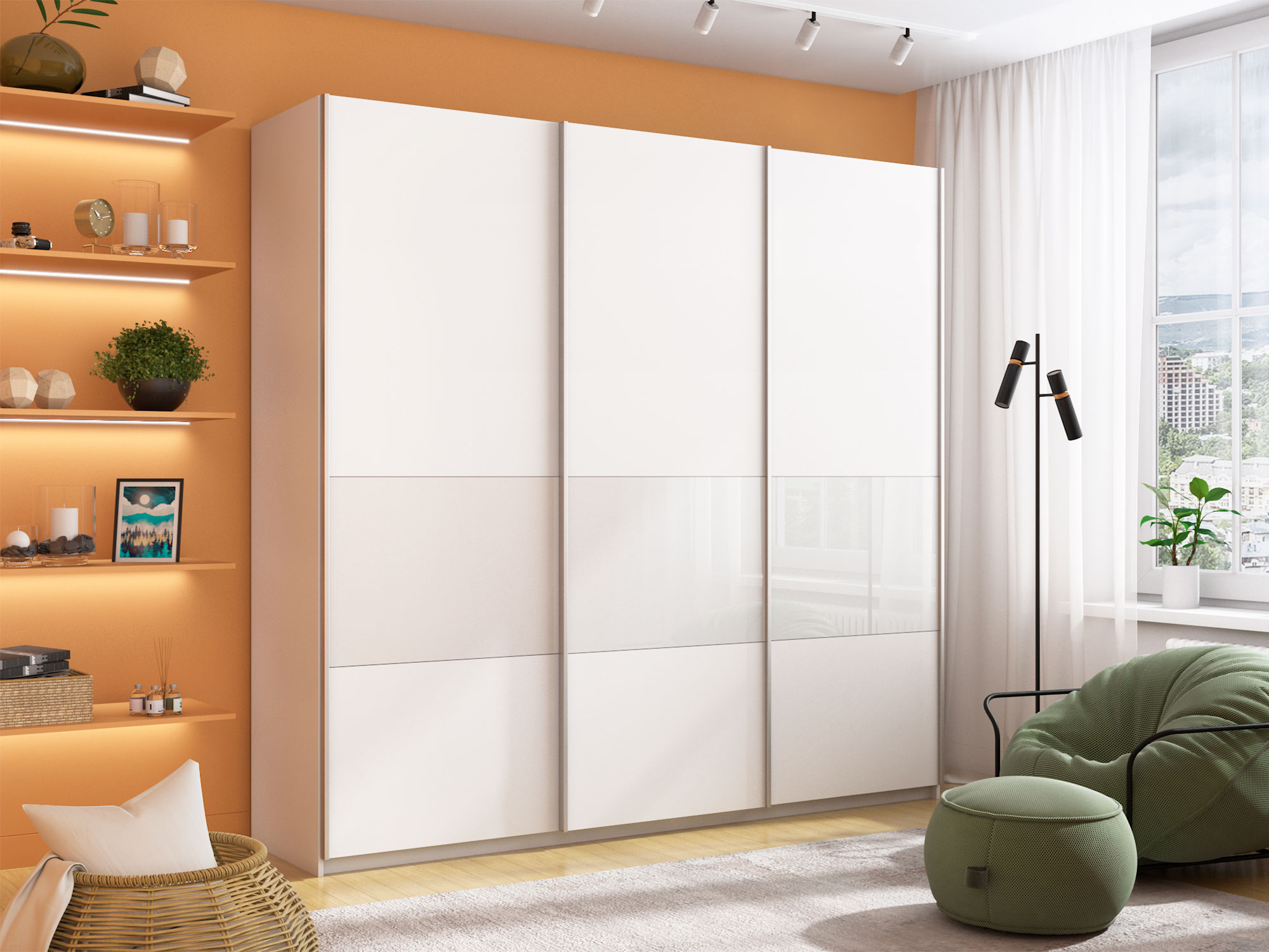 Шкаф-купе Прайм Широкий 3-х дверный ДСП/вставки Стекло Белое Белый Снег