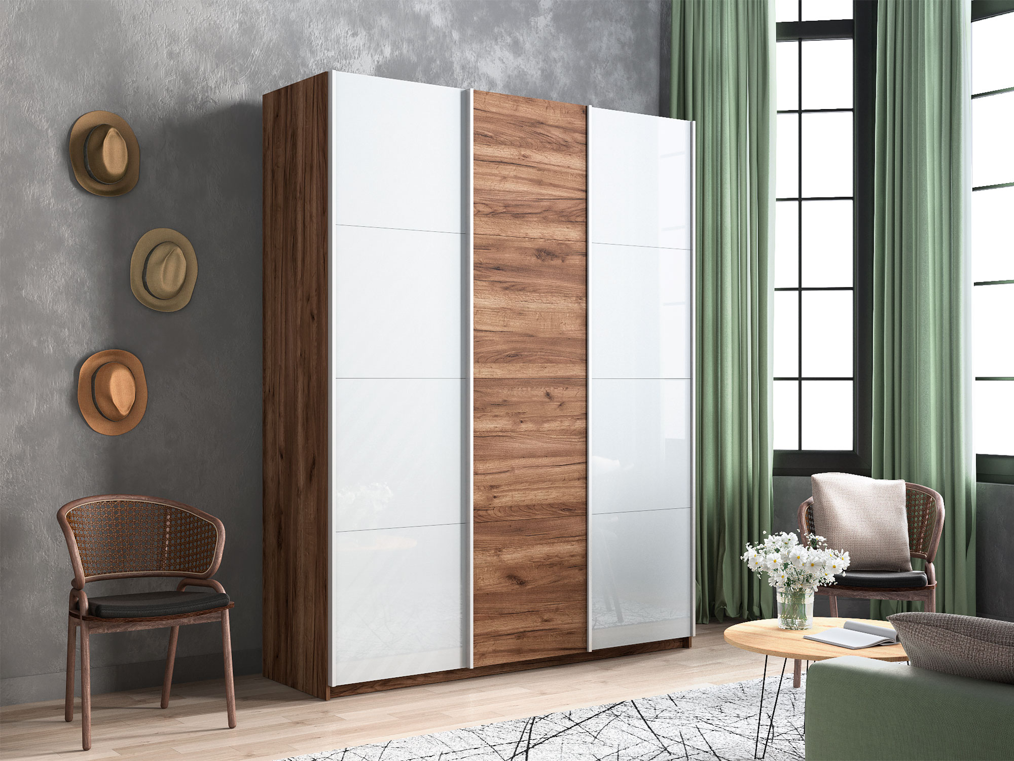 - Шкаф-купе Прайм Широкий 3-х дверный два белых стекла/ДСП Крафт табачный