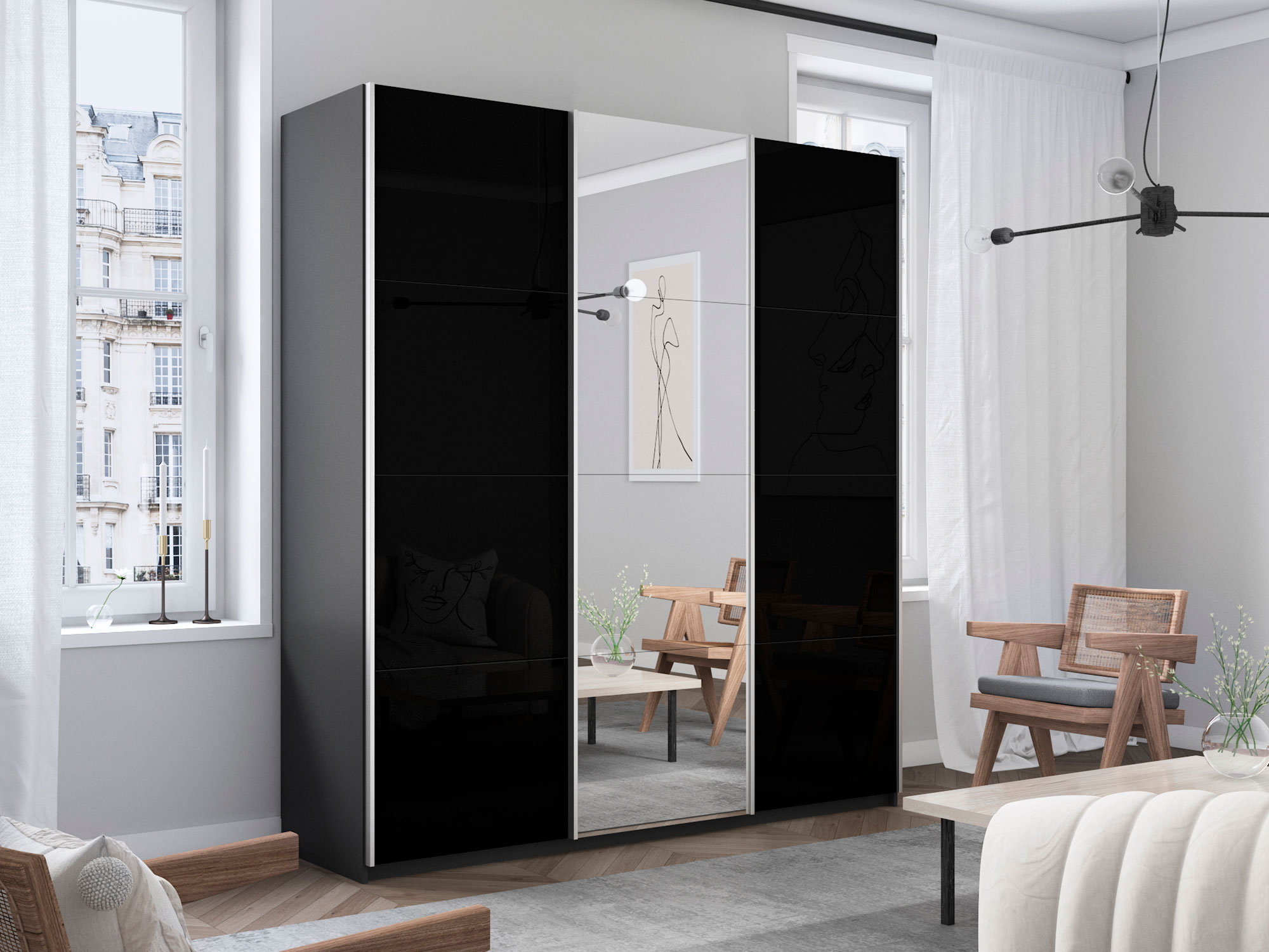 - Шкаф-купе Прайм Широкий 3-х дверный два черных стекла/зеркало Серый Диамант