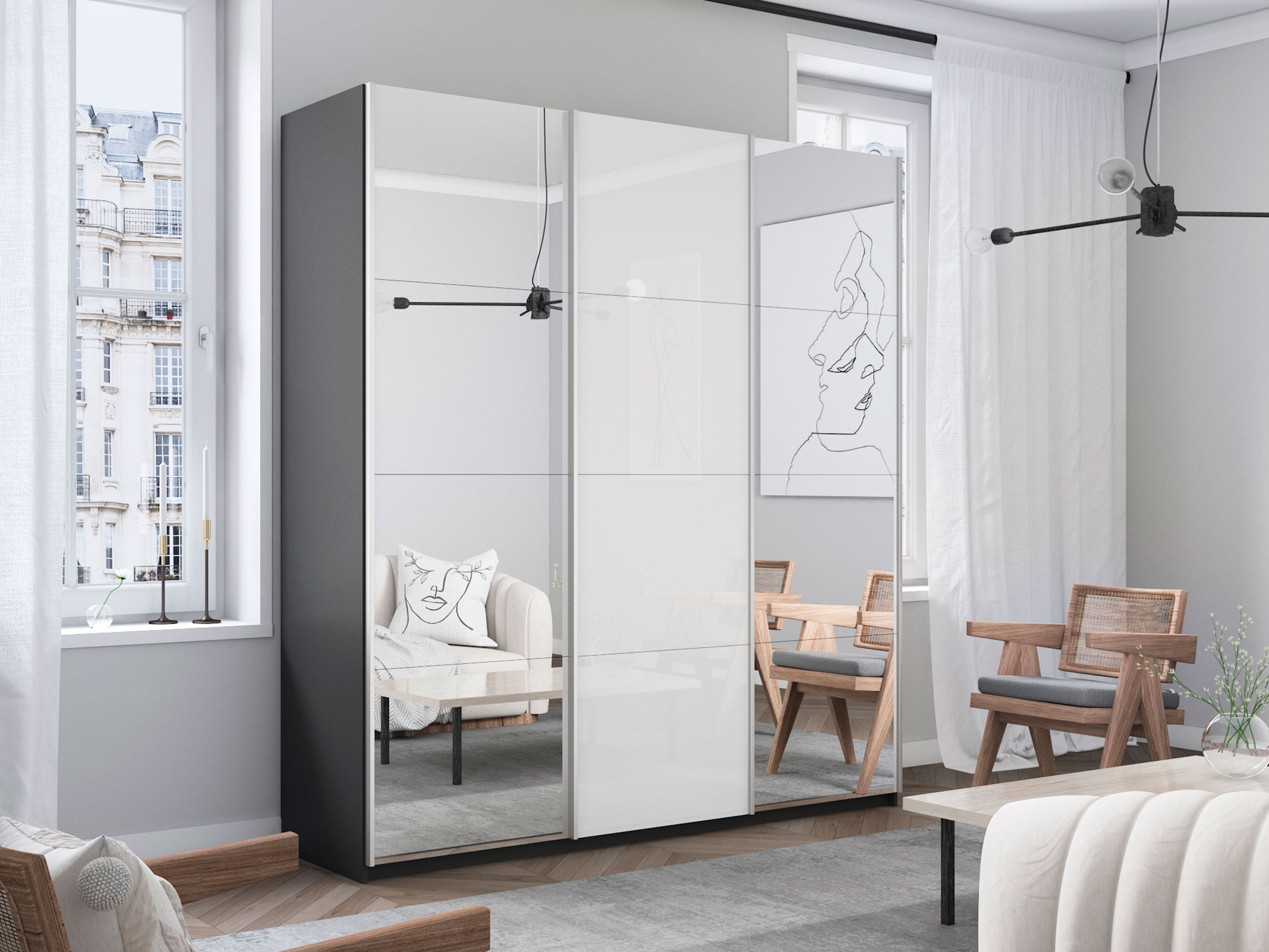 Шкаф-купе Прайм Широкий 3-х дверный два зеркала/стекло белое Серый Диамант
