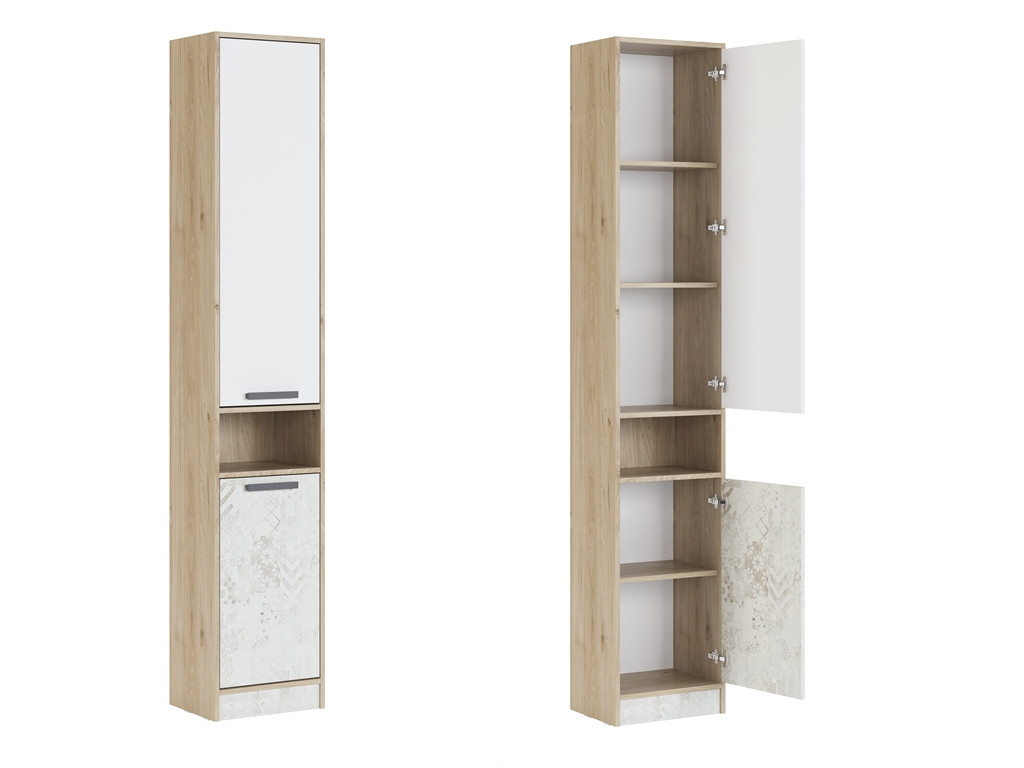 - Пенал имеет два распашных фасада, три съемные полки и открытую нишу.