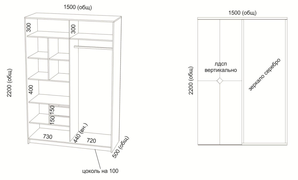 Размеры: (В*Г*Ш) 2200*500*1500 мм.